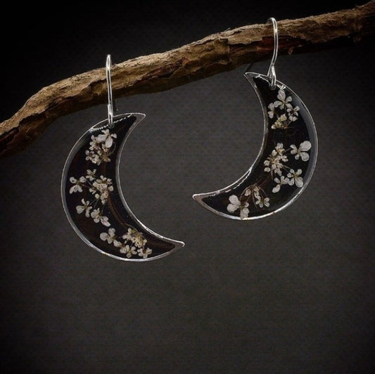 Moon Crescent Earrings with Pressed Flowers|Floral & Moon Jewelry