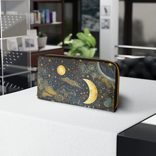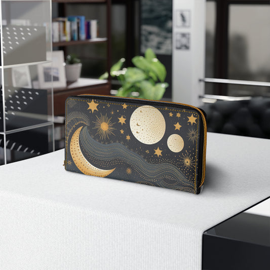 Celestial Moon Zipper Wallet | Cosmic Stars Wallet Design
