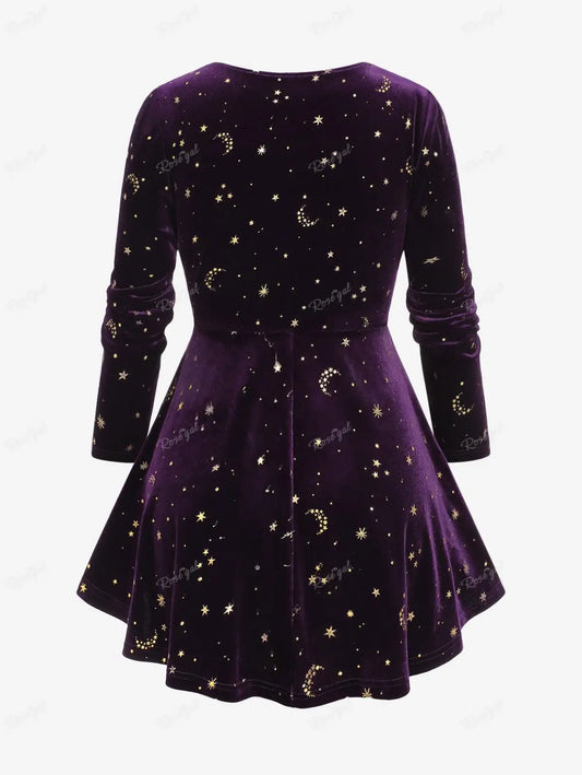 Whimsigothic Celestial Velvet Dress, Gothic Style Starry Moon Lace Dress