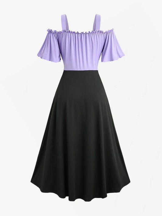 Purple Medieval Woman's Corset Dress, Aesthetic Ruffled Shoulders