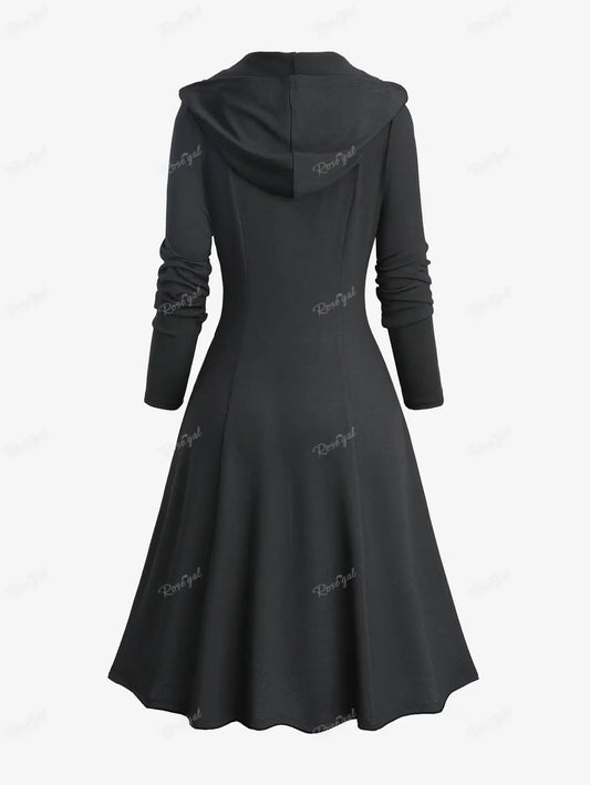 Women's Black, Red, and Blue Grommet Gothic Hooded Top Flare Sleeve Dress