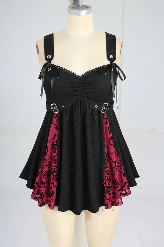 Elegant Floral - Gothic Dress, Black and Red Patchwork with Grommet Buckle