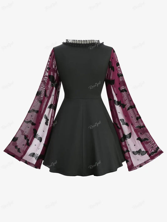 Red Gothic Bat Split Flare Sleeves, Women's Mesh Dress