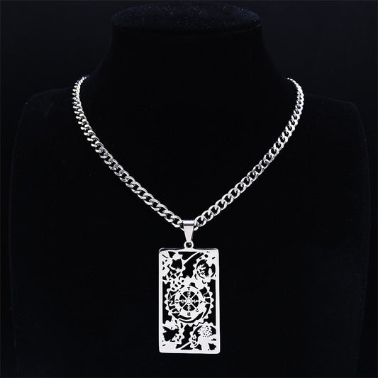 Stainless Steel 'Wheel Of Fortune Tarot Card Necklace | Rider-Waite-Smith Jewelry