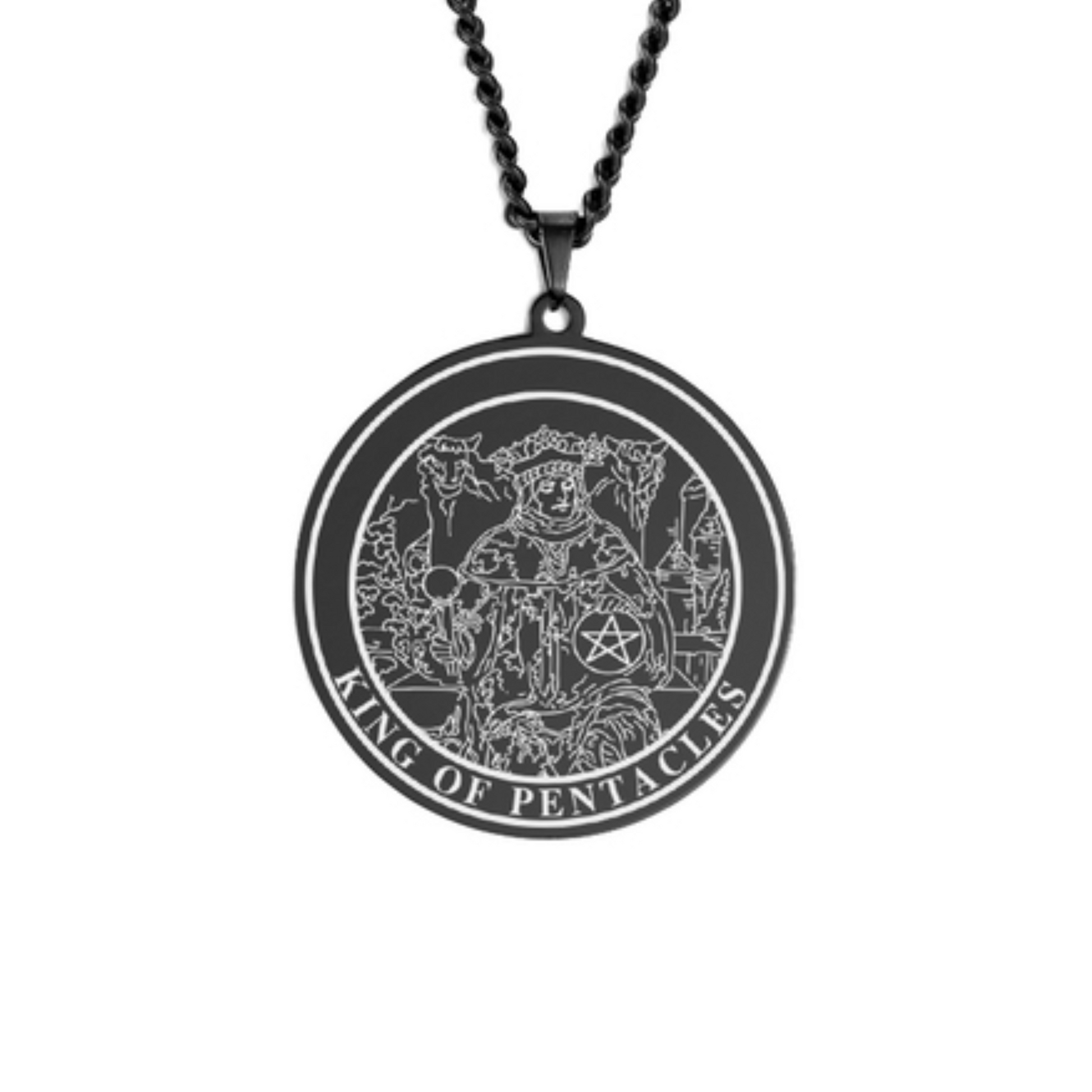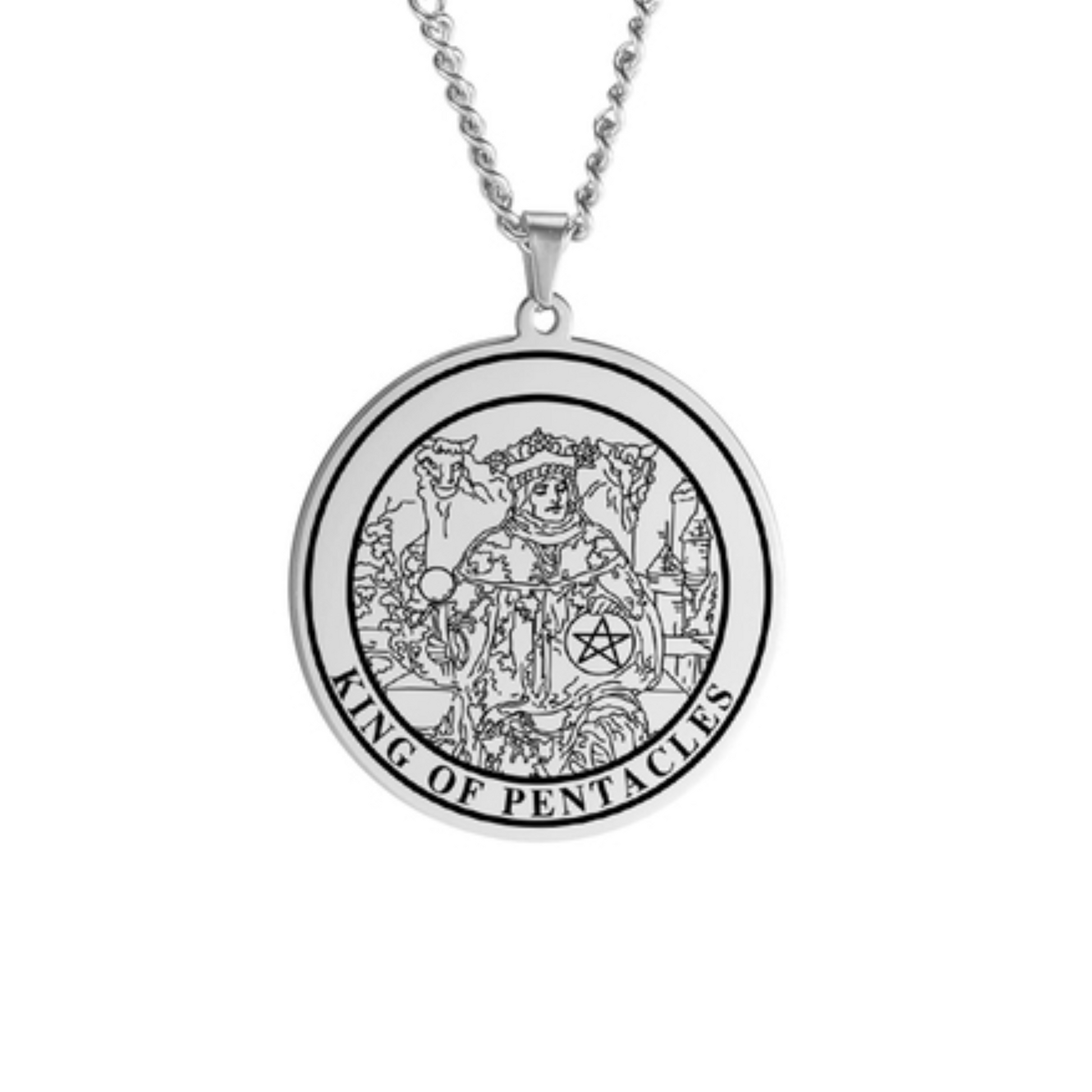 This 'King of Pentacles' Round Pendant Tarot Card Necklace is crafted from high-quality stainless steel, and includes three distinct finishes: Gold, Silver, and Black. Perfect for enthusiasts of Tarot Card Divination.
