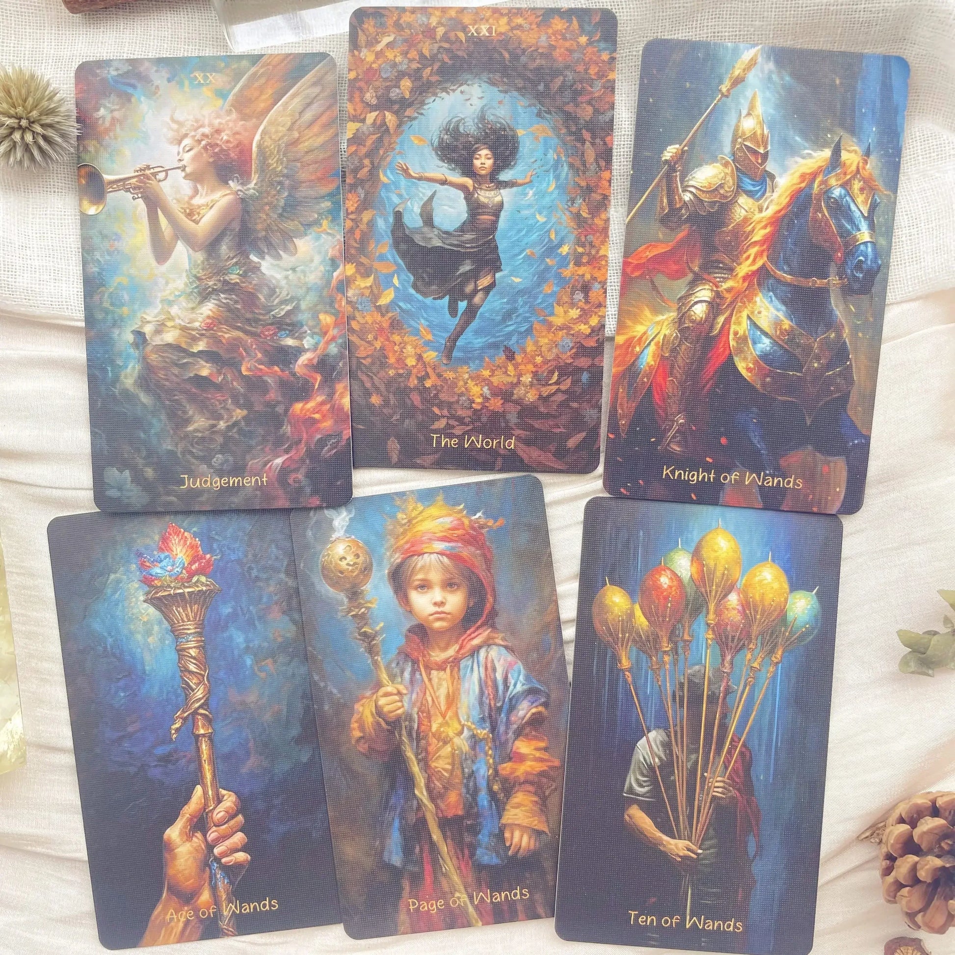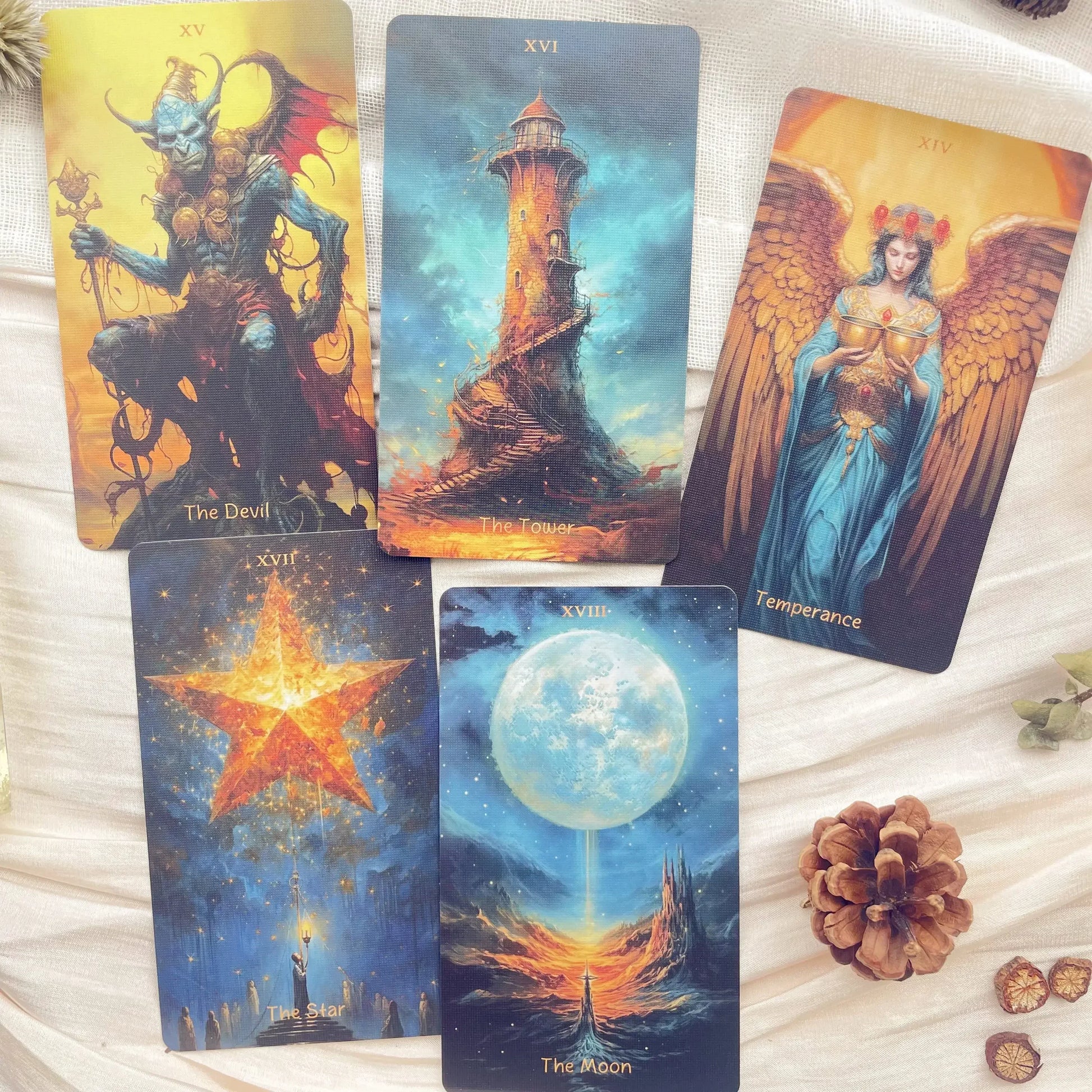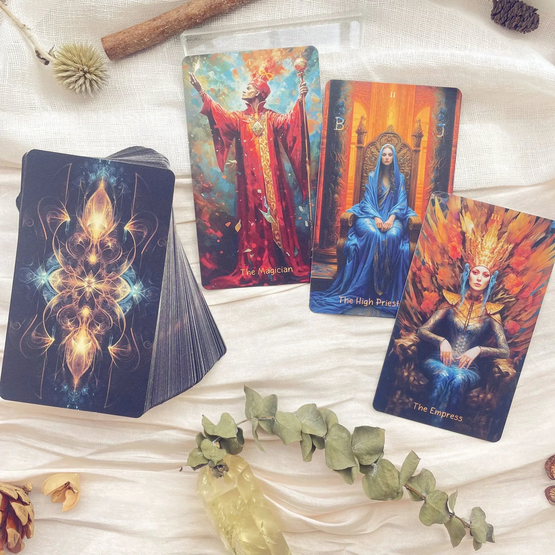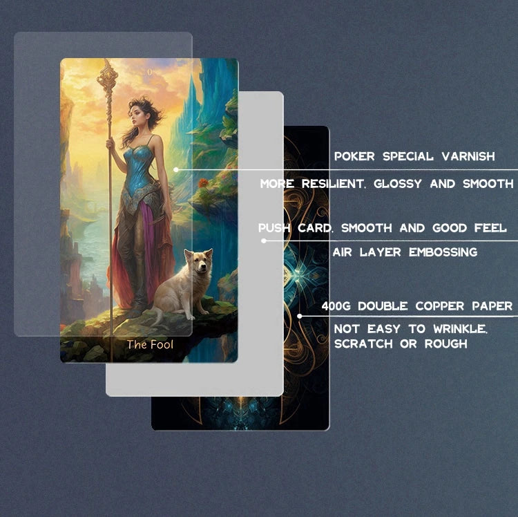 Crafted from luxurious 400g double copper paper with poker varnish and embossing, each card offers a smooth shuffle and a premium feel. The vibrant colors and deeply symbolic artwork make readings intuitive and insightful. Whether you're a beginner or a seasoned reader, this deck will illuminate your spiritual path with its stunning starry visuals and cosmic wisdom.