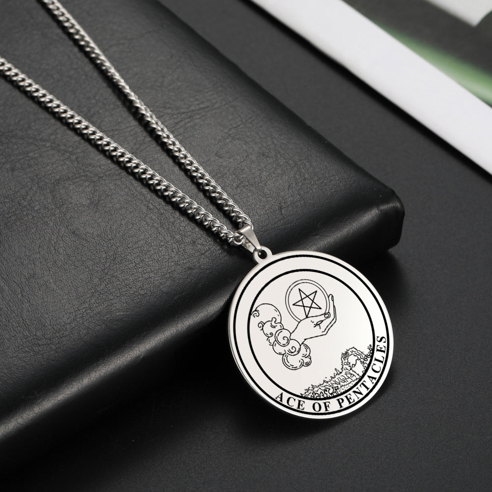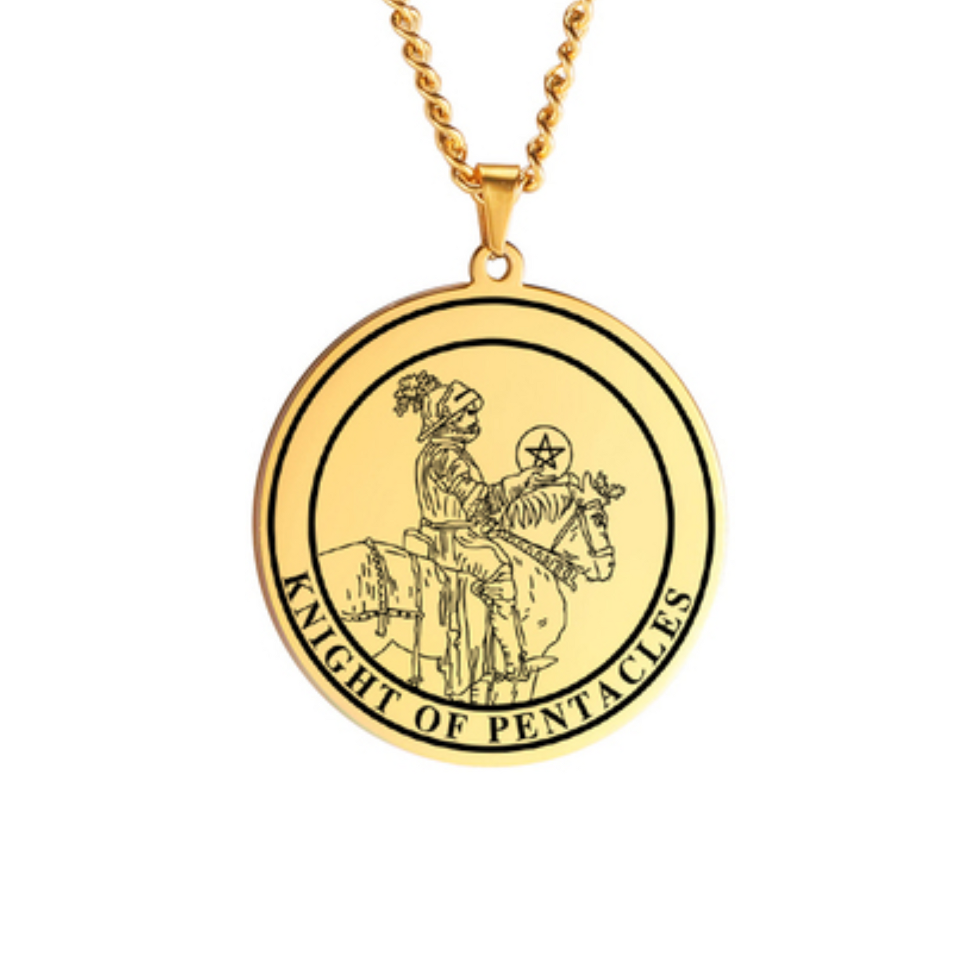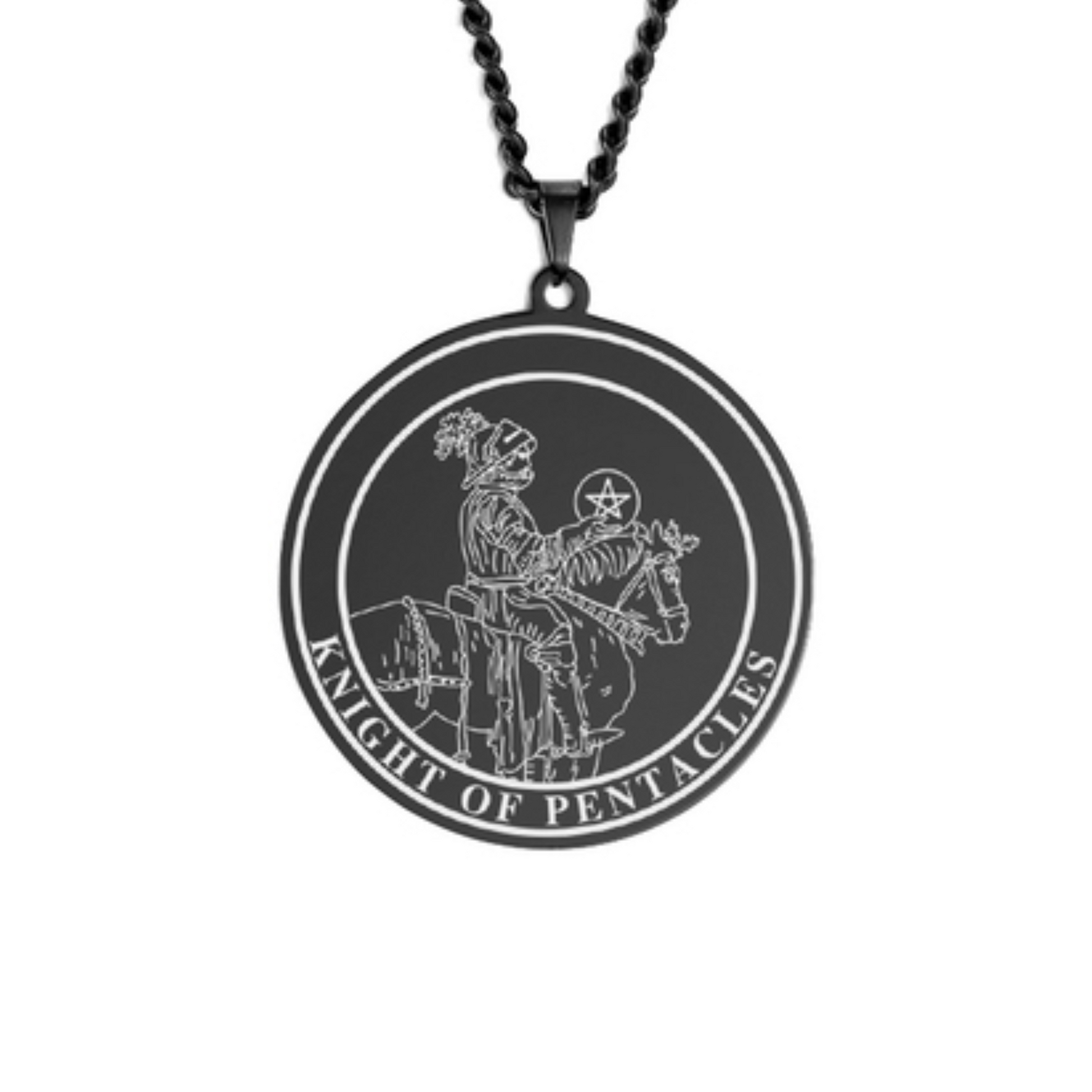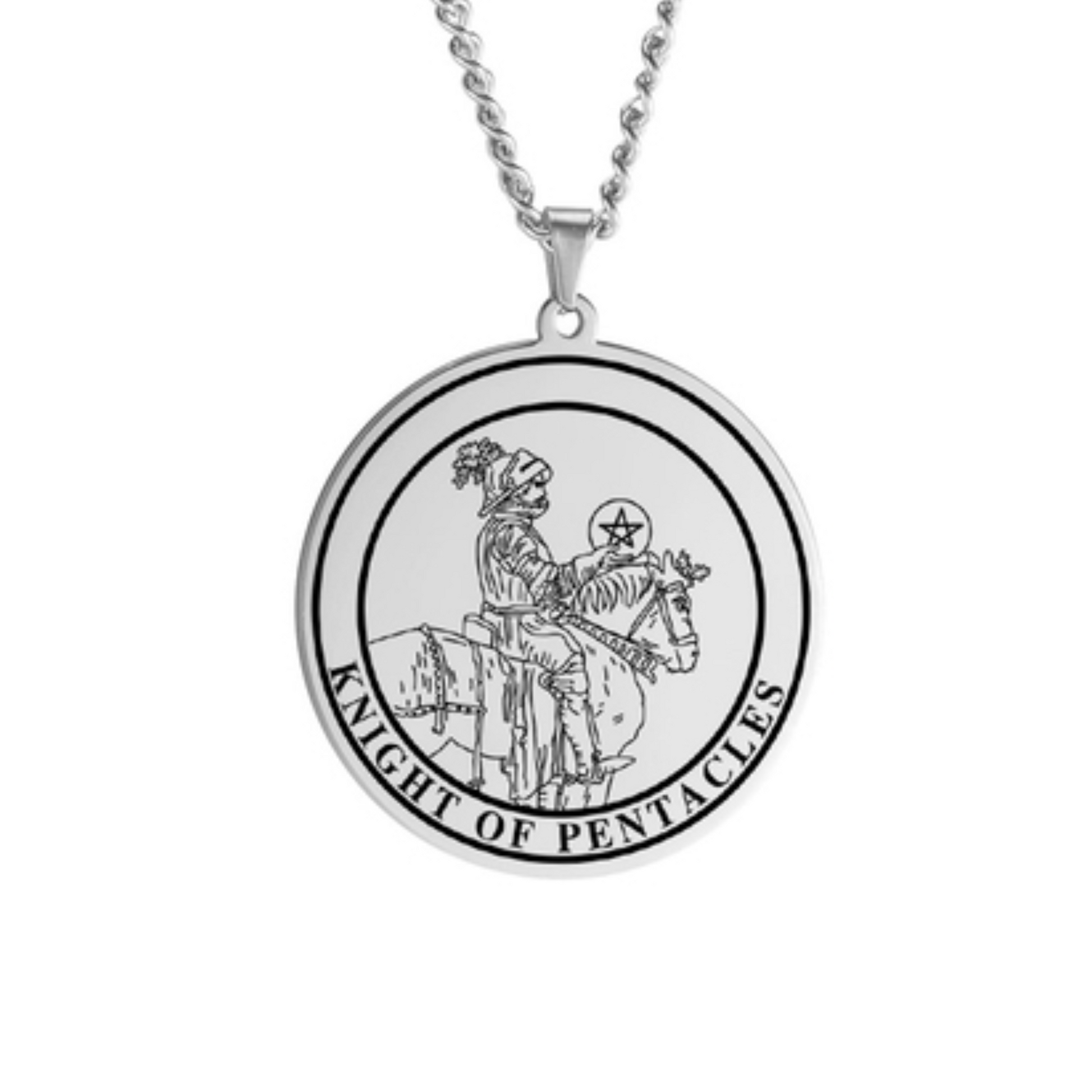 This 'Knight of Pentacles' Round Pendant Tarot Card Necklace is crafted from high-quality stainless steel, and includes three distinct finishes: Gold, Silver, and Black. Perfect for enthusiasts of Tarot Card Divination.