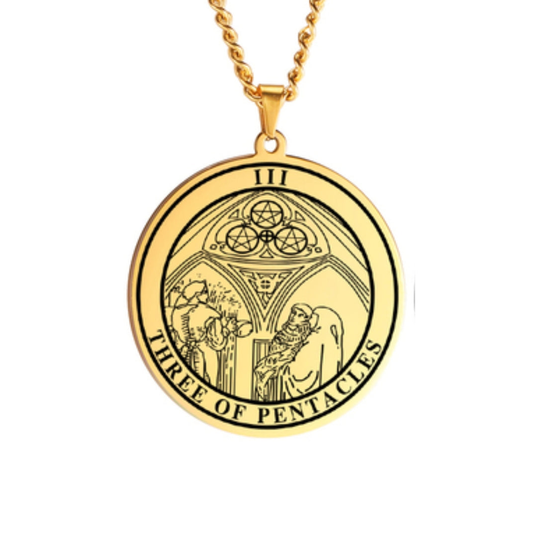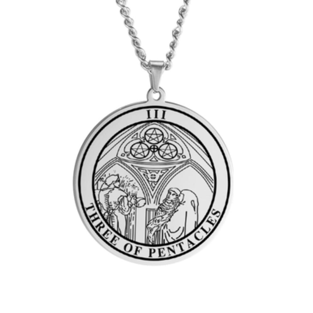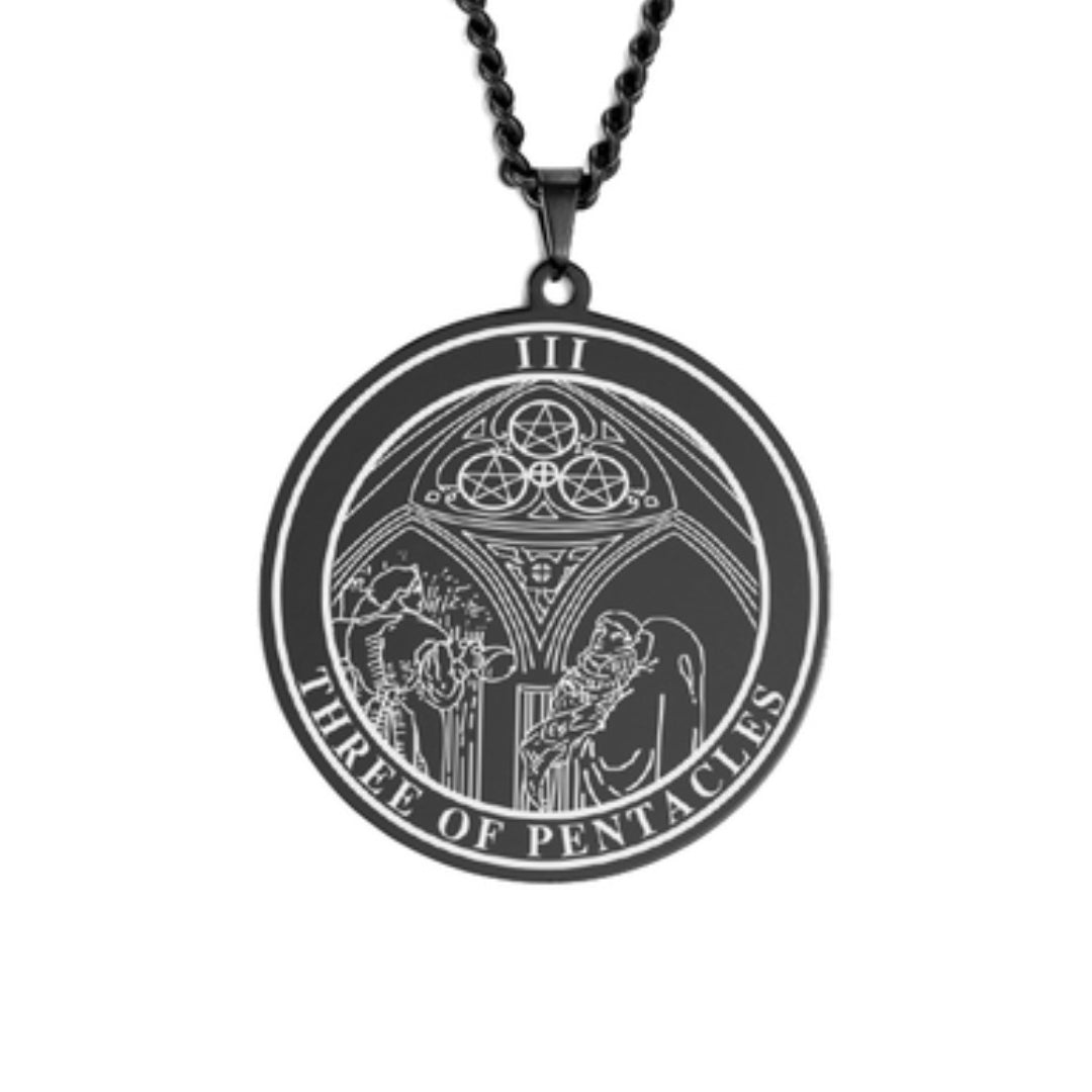 This 'Three of Pentacles' Round Pendant Tarot Card Necklace is crafted from high-quality stainless steel, and includes three distinct finishes: Gold, Silver, and Black. Perfect for enthusiasts of Tarot Card Divination.
