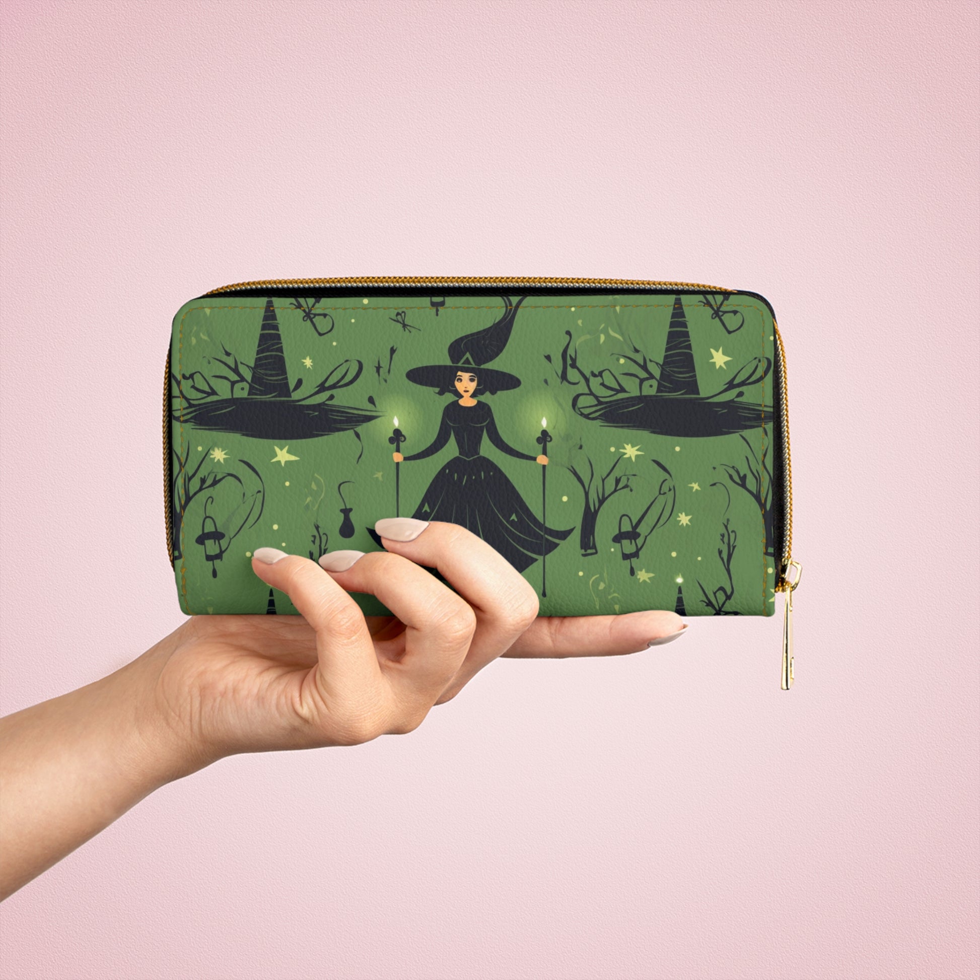 Get ready to embrace your inner witch with the Witchy Green Zipper Wallet! This stunning wallet not only holds all your essentials like credit cards, cash, and driver's licenses, but it also adds a touch of dark forest magic to your everyday style. Crafted from cruelty-free faux leather, this wallet is both functional and fashionable. Don't miss out on this must-have accessory for any witchy look!