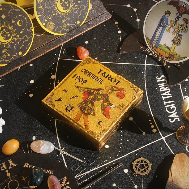 - Design: Vintage 1909 tarot artwork with elegant gold foil accents