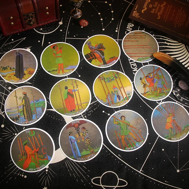 Experience tarot in a whole new way with the 1909 Circular Gold Foil Tarot Card Deck, a stunning reinterpretation of the classic Rider-Waite-Smith deck in an elegant round format. This unique 78-card deck retains the rich symbolism of the original 1909 design while adding a modern circular shape and gold foil detailing, bringing a touch of luxury and a fresh perspective to your readings.