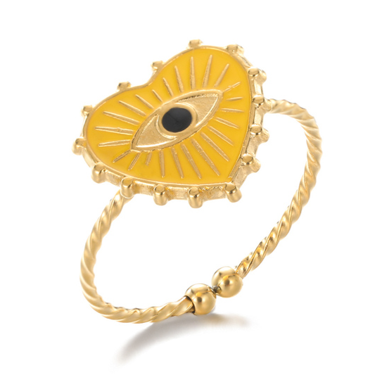Adorn yourself with this vibrant evil eye heart-shaped ring—a unique, spiritual piece of Hamsa-inspired jewelry! Let its colorful beauty bring you good luck and protection!