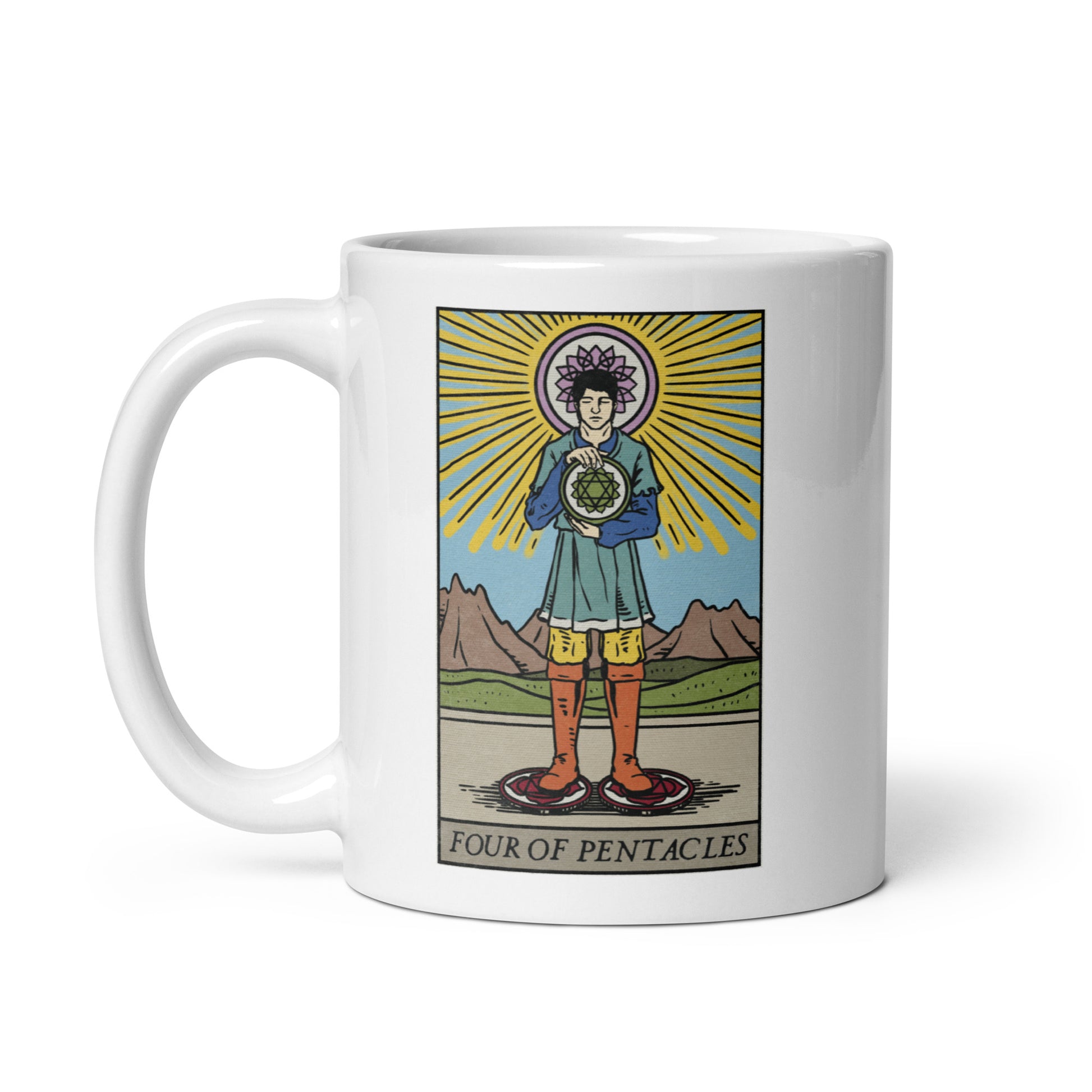 Coffee and tea enthusiasts who are Tarot Card and Reading fans will delight in the 'Four of Pentacles' Chakra Design Mug. This exclusive Tarot Awakened design replaces the pentacles with the Root, Heart and Crown Chakras, providing a reminder for chakra healing.