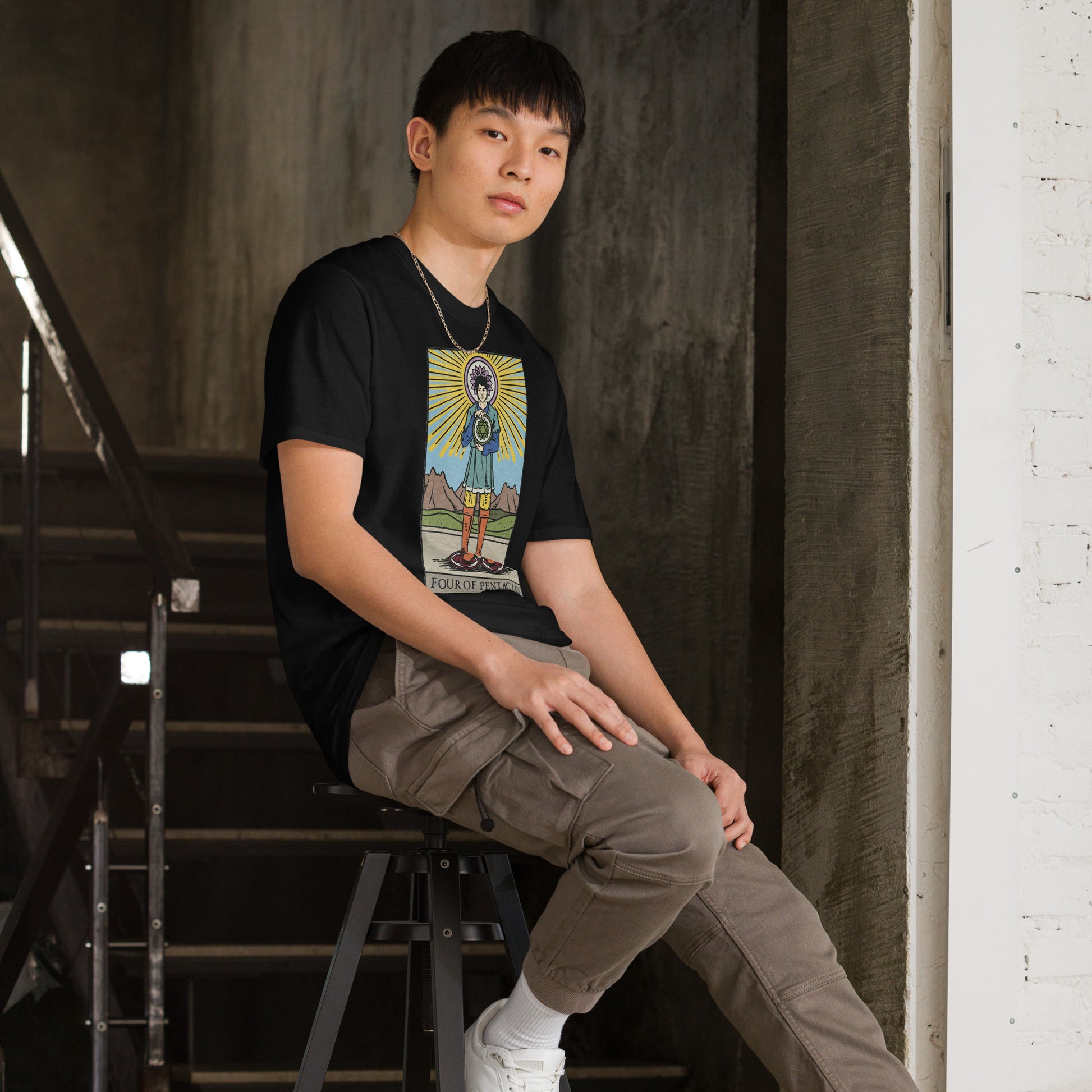 This 'Four of Pentacles' Minor Arcana Chakra T-shirt features an eye-catching design ideal for Tarot card enthusiasts and anyone focused on chakra healing. Crafted with a comfortable fit and stylish aesthetic, it's a great choice for spiritual seekers, Tarot readers, or just anyone that loves vibrant clothing.