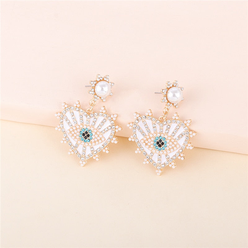 Evil Eye Crystal Pearl Heart Drop Earrings | Spiritual Jewelry