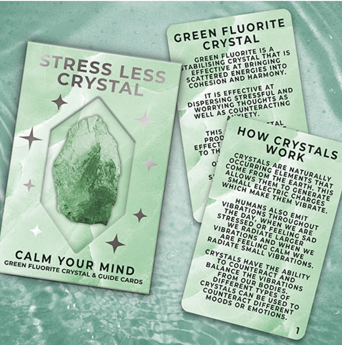 Gift Republic's Stress Less Crystal and Cards provides an effective solution to help manage stress. The kit contains a green fluorite crystal and accompanying cards to help guide users through stressful and challenging situations.
